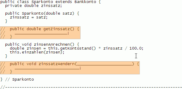 gekennzeichneten Auslassungen und testen die erweiterten Klassen.